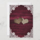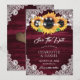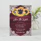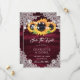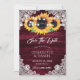 Casamento floral ruidoso da Burgundy salve os cartões de data com girassóis em um fundo de madeira enfeitado com rendas florais brancas e luzes de cordas. Itens correspondentes disponíveis.