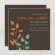 Deixe seus amigos e entes queridos saberem que você vai se casar com esses modernos e elegantes anúncios de data que apresentam membros/folhas cor de laranja e cor de rosa em um fundo marrom chocolate. Design ultra-moderno com linhas e fontes limpas nítidas.