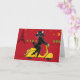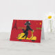 Um cartão de poodle divertido para enviar seus amigos tem um poodle preto em fundo vermelho brilhante com a Torre Eiffel.