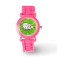 Cuidado com o presente para uma criança. Cartoon de ovelha com fundo verde no "Child's Watch".