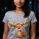 "This incredibly cute and festive design features a cheerful cartoon reindeer with a bright red nose and a wide, friendly smile. Its antlers and neck are playfully tangled in a string of warm, glowing Christmas lights. The bright eyes and innocent expression give the character an irresistible charm, making it instantly appealing for the holidays. This graphic is highly versatile for children's apparel and accessories, holiday greeting cards, seasonal mugs, or novelty Christmas decorations, perfect for spreading bright, joyful holiday cheer."