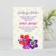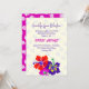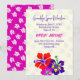 Convite de formatura de casa aberta com design de flores de hibisco em negrito. Perfeito para a formatura do ensino médio de uma filha. O nome dela está em letra cursiva roxa no topo com data, nome da escola e turma abaixo. "Casa Aberta" está em rosa escuro negrito com mais texto abaixo para horário e local da festa. Flores vermelhas, roxas e rosas na parte inferior, e fundo de boinas de formatura caindo, que continua no verso sobre um fundo rosa brilhante.