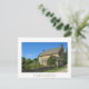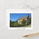 Cartão postal de uma cabana de pedra de algodão, de cor inglesa, com um jardim floral e uma bandeira britânica em Cotswolds, no Reino Unido.