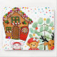 Mousepad de Natal caprichoso com uma casa de biscoito decorada com doces, uma árvore simples decorada, um ursinho sorridente, um ratinho alegre e uma rena em uma cena festiva brilhante com confetes coloridos. Tons quentes de vermelho, verde, dourado e pastel dão a este design de férias divertido um visual doce de livro de histórias para decoração de mesa sazonal.