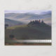 Cartão postal de uma fazenda, no nevoeiro matinal, à madrugada do amanhecer na Toscana, entre as colinas rolantes do Vale de Val d’Orcia entre Pienza e San Quirico d’Orcia, em Itália, com um bar esbatido e o texto: "Toscana".