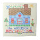 Este design personalizado da casa de campo é feito para assemelhar-se a um demonstrador do bordado do ponto da cruz do vintage. Mostra uma casa azul feita de "x " s com um pássaro, o sol e abundância dos corações e das flores no mesmo estilo. O fundo é bege com um leve teste padrão da verificação olhar como o material do bordado.
