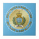 A casaco nacional de armas do microestado, São Marino, é infundida no centro de uma forma falsa de círculo dourado. Em torno dessa imagem estão os nomes oficiais do país, em italiano e inglês.