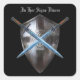 Um Casaco de Braços com duas espadas compridas sobre o escudo do aquecedor com design Celta. O lema dos Cavaleiros Templários, "In Hoc Signo Vinces", ou "In this sign win" é escrito em cima na fonte do Outline da Carta Negra. Ou, personalize esta poderosa herança de fé com seu próprio lema favorito!