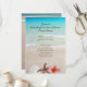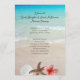 Um programa de casamento de praia para uma cerimônia casual e curta do mar. Cartões planos de 5 x 7 polegadas contêm uma cena de praia, dólar de areia, estrela e flor de plumeria rosa. O texto preto é fácil de personalizar com nomes da noiva e noiva no topo, data e local da cerimônia e um parágrafo para informações sobre cerimônias. Inclua também uma mensagem para os convidados, se desejar. Os cantos entalhados são opcionais, com upgrades de papel disponíveis.