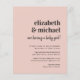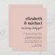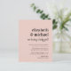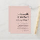 Um convite para o chá de uma menina cor-de-rosa, com orçamento mínimo moderno, de casal cor-de-rosa, com os nomes dos pais e "estão tendo um bebê!" em uma mistura de tipografia ousada e um roteiro para na moda, e os detalhes do chá em uma simples tipografia.
