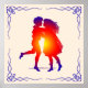 Casal de dança Vintage, silhueta roxa escura, estilo antigo, dançando moça e garoto sobre fundo de marfim tenro e quadro floral
