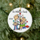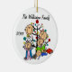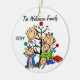 Um ornamento cerâmico redondo bonito do feriado do Natal da lembrança caracteriza uma figura família da vara que inclui um pai, uma mamã, uma menina, uma menina da criança, e um bebé na frente de uma árvore de Natal decorada com áreas que você pode personalizar com seu nome de família e o ano em curso! Este ornamento bonito da lembrança do feriado faz um grande presente para que a família nova comemore um ano especial!