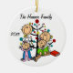 Um ornamento cerâmico redondo bonito do feriado do Natal da lembrança caracteriza uma figura família da vara que inclui um pai, uma mamã, uma menina, e uma menina da criança na frente de uma árvore de Natal decorada com áreas que você pode personalizar com seu nome de família e o ano em curso! Este ornamento bonito da lembrança do feriado faz um grande presente para que a família nova comemore um ano especial!