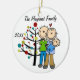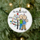 Um ornamento cerâmico redondo bonito do feriado do Natal da lembrança caracteriza uma figura casal da vara com um bebé em uma cobertura azul que está na frente da árvore de Natal decorada com áreas que você pode facilmente personalizar com seus nome e data de família ao ano em curso! Este ornamento bonito da lembrança do feriado faz um grande presente para qualquer um que teve um bebé novo no ano em curso!