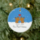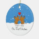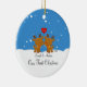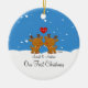 Nossos primeiros enfeites de natal caracterizam um grupo bonito do casal da rena em um fundo azul enchido neve da neve! Personalize com sua informação e data e você são todos ajustam-se para ir! Presente datado maravilhoso da lembrança para seu primeiro Natal e uma grande adição a você coleção dos enfeites de natal.