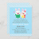 Segure um chá de fraldas casal e convide os convidados com este agradável, colorido e alegre convite ao chá de fraldas! Ele apresenta uma família coelhinha com coelho de papai em uma teia verde, coelhinha de mamãe com arco vermelho e vestido e um coelhinho de bebê embrulhado em amarelo com um pacificador na boca. Padrão de faixas inclinadas azul e branca para a borda. Personalize facilmente com os detalhes do seu partido. A design é neutra em termos de gênero e vai manter os convidados a adivinhar o gênero do bebê.