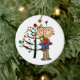 Uma cerâmica redonda bonito guardando o enfeite de Natal apresenta um casal de figuras de pau que obviamente está apaixonado.