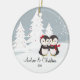 Nosso Enfeites de natal personalizado de amor com pinguins, com data única, apresenta um casal de pinguim giro em um fundo de neve de árvore de natal! Personalize com suas informações e data e você está pronto para ir! Um maravilhoso presente de guardiã para um primeiro Natal de casais e um suplemento de excelente para a sua coleção de enfeites de natal.