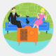 Este Casal Retroativo com Cat Stickers apresenta um casal de desenho animado tentando ficar aconchegante enquanto assiste televisão em um sofá azul moderno e meio século. O gato, no entanto, tem outras ideias. De um lado do sofá, há um homem bonito em um terno preto com gravata vermelha. Do outro lado do sofá de na moda, há uma linda mulher loira em uma forma de vestido rosa quente, que se encaixa. As coisas estariam se não fosse pelo gato preto, que fez reivindicações para a almofada de sofá central. Este estilo de 1960, design de arte minimalista é colocado em uma sala de na moda. O pano de fundo do sofá é uma parede verde de pedra. No fundo do aqua, há um tapete redondo, verde, que combina com a parede de pedra. Na frente da design, vemos a parte de trás de um televisor laranja com orelhas de coelho, que parece estar tocando o programa favorito do gato.