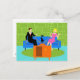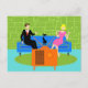 Este Casal Retroativo com o Cat Postcard apresenta um casal de desenho animado tentando se aconchegar enquanto assiste televisão em um sofá azul moderno e meio século. O gato, no entanto, tem outras ideias. De um lado do sofá, há um homem bonito em um terno preto com gravata vermelha. Do outro lado do sofá de na moda, há uma linda mulher loira em uma forma de vestido rosa quente, que se encaixa. As coisas estariam se não fosse pelo gato preto, que fez reivindicações para a almofada de sofá central. Este estilo de 1960, design de arte minimalista é colocado em uma sala de na moda. O pano de fundo do sofá é uma parede verde de pedra. No fundo do aqua, há um tapete redondo, verde, que combina com a parede de pedra. Na frente da design, vemos a parte de trás de um televisor laranja com orelhas de coelho, que parece estar tocando o programa favorito do gato.