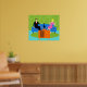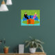 Este Casal Retroativo com Cat Poster apresenta um casal de desenho tentando se aconchegar enquanto assiste televisão em um meio século moderno, sofá azul. O gato, no entanto, tem outras ideias. De um lado do sofá, há um homem bonito em um terno preto com gravata vermelha. Do outro lado do sofá de na moda, há uma linda mulher loira em uma forma de vestido rosa quente, que se encaixa. As coisas estariam se não fosse pelo gato preto, que fez reivindicações para a almofada de sofá central. Este estilo de 1960, design de arte minimalista é colocado em uma sala de na moda. O pano de fundo do sofá é uma parede verde de pedra. No fundo do aqua, há um tapete redondo, verde, que combina com a parede de pedra. Na frente da design, vemos a parte de trás de um televisor laranja com orelhas de coelho, que parece estar tocando o programa favorito do gato.