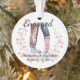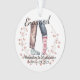 Casal de meias celebra "Engajado" Este ornamento de dupla face torna-o oficial para o casal recém-noivo enquanto passam este Natal como noivo e noiva. Ele exibe as pernas de calça e as meias inspiradas em feriado de um casal virado um para o outro. Uma coroa de morango sagrada rodeia a dupla. As cores são macia e muda. Esta é a excelente de dar ao seu companheiro ou fazer um presente adorável para o casal. Este ornamento personalizado oferece quatro pontos para personalização: Nome 1, Nome 2, a data oficial em que o par ficou noivo, e um quarto no verso para deixar uma Nota Mais Doce se desejar.