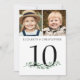 Crie um número memorável da mesa de casamento com esses cartões com fotos 5x7 mostrando várias fotos da noiva e do noivo ao longo dos anos para uma placa de número de mesa divertida para os convidados de casamento. O design apresenta um simples e elegante spray verde. É divertido ter fotos da mesma idade no mesmo sinal e fotos diferentes em cada mesa que os hóspedes se misturam. Impresso em ambos os lados para visualização dupla. ASSISTÊNCIA: para obter ajuda com a modificação ou personalização do design, alteração de cor, redimensionamento ou transferência do design para outro produto, entre em contato com o designer ANTES DE ENCOMENDAR através da guia MENSAGEM de Bate-papo Zazzle abaixo ou envie um email para makeitaboutyoustore@gmail.com.