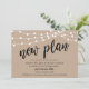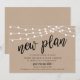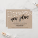 Este é um cartão de Anúncio de Casamento Adiado, com título do cartão, Novo Plano, em fonte de letra cursiva preta, tema de fazenda rústica moderna em kraft, luzes de corda, design.