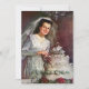 Ilustração antiga de amor e romance com uma noiva feliz em seu vestido de noiva com véu de renda. Ela está cortando seu bolo de casamento decorado com rosas vermelhas e outras flores na recepção.