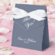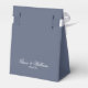 Casamento azul clássico Obrigado caixa de favor. Obrigado com nomes de noiva e noivos e data no texto do script branco.