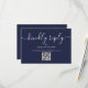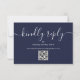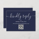 Um script de assinatura simples e elegante responde gentilmente à placa RSVP azul marinho com código QR. Projetado por Thisnotme©