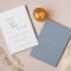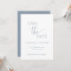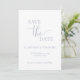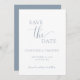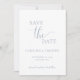 Este simples cartão de salvamento minimalista é perfeito para anunciar seu próximo casamento. Esta placa apresenta um design azul e branco empoeirado com texto elegante. Personalize o texto na parte frontal e traseira da placa com todos os detalhes do dia especial. #savethedate #nosso casamento #minimalistcasamento