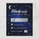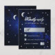 Um convite de RSVP de casamento econômico com tema de casamento celestial, com a lua e estrela em um fundo azul de noite estrelada. As palavras "Respondam por gentileza" e a letra M são escritas em uma fonte caligráfica elegante. A lua e os espaços para preencher são em folha de prata falsa, os espaços para aceitar e recusar são estrelas de prata falsa. No cartão preto, há apenas a lua e estrela em um fundo azul de noite estrelada.