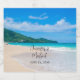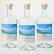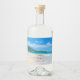 Etiquetas de bebidas com uma fotografia de um local de férias maravilhoso. Céu azul brilhante, praia arenosa macia com águas azuis e cristalinas tropicais. Uma árvore esmagadora cobriu a montanha ao fundo. Fotografia cênica e tranquila.