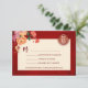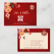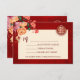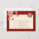 Tonalidades vermelhas, laranja e neutras florescem em um fundo vermelho brilhante e um símbolo de felicidade dupla dourada. Cartão de Casamento Chinês RSVP com um código qr digitalizável e nomes de noiva e noiva.