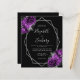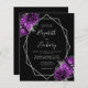 Este convite de casamento moderno e elegante apresenta uma moldura geométrica prateada decorada com flores roxas e prateadas em um fundo preto. O texto personalizável combina escrita à mão caprichosa prateada cinza, fontes copperplate e itálico. Adicione detalhes adicionais no verso, juntamente com um código QR para ajudar seus convidados a visitar o site do seu casamento.