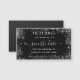 Um casamento de moda Salve o ímã de Datas. Um fundo na moda preto. Decorado com faíscas de brilho prateado. Personalize e adicione uma data, um lugar e seus nomes. Salvar a data é escrito com um script de estilo moderno, escrito à mão, com alternâncias.