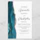 A borda esquerda deste elegante convite de casamento moderno apresenta uma cor azul-lacrimogênea agata borda com falsa rosa dourada. O texto personalizável combina o script de cinza de carvão e as fontes sans serif em um fundo branco. O verso fornece espaço para detalhes do casamento em um fundo branco sólido, junto com um código QR que os convidados podem digitalizar para visitar seu site e RSVP, o que economiza o custo de imprimir e enviar cartões RSVP separados.