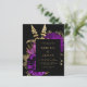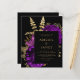 Este elegante e modesto convite de casamento apresenta um buquê floral romântico e exuberante em roxo com folha de ouro e folhagem brilhante num fundo negro. Personalize o texto dourado em fontes na moda em um retângulo preto. O verso fornece espaço para detalhes do casamento em um fundo preto sólido, junto com um código QR que os convidados podem digitalizar para visitar seu site e RSVP, o que economiza o custo de imprimir e enviar cartões RSVP separados.