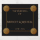 O preto elegante e Dramático e o ouro intrincam a mandala tripla do nó celta. Espirais eternos e nós de trindade em ouro sobre fundo preto. Celebre o eterno vínculo de seu amor com este elegantemente dramático design Celta de Nó preto e Ouro. Personalize com os nomes da noiva e do noivo e a data.