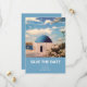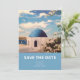 Esta é uma pintura à mão acrílica da Grécia Santorini para salvar a data. Com um fundo azul claro, esta design moderna e simples é perfeita para o casamento de destino na Grécia. Perfeito para quem ama a praia, flores, arte e arquitetura. Personalize e personalize com suas informações de casamento.