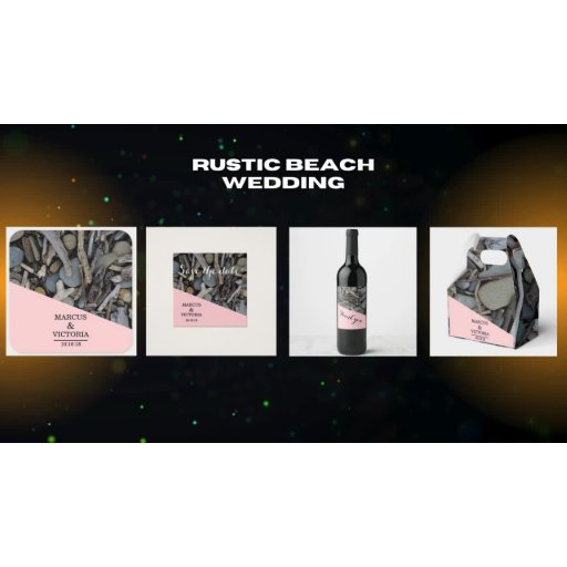 Um design de salvamento de data que pode ser personalizado com a noiva e os nomes de grupos. O fundo é uma colagem de uma faixa cor-de-rosa e uma foto de pedras de praia e madeira derivada.