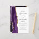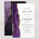 A borda esquerda deste elegante convite de casamento moderno apresenta uma cor d'água roxa, borda agitada, aparada com falso brilho dourado. O texto personalizável combina o script de cinza de carvão e as fontes sans serif em um fundo branco. Um design de agate roxo correspondente é exibido na parte traseira da placa.