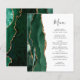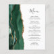 A borda esquerda deste elegante cardápio moderno de casamento apresenta uma esmeralda verde aquarela agata borda com falsa brilho dourado. O texto personalizável combina o script de escrita manual de cinzas de carvão branco e as fontes de impressão em um fundo branco. O verso apresenta um design emerald verde e dourado.