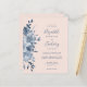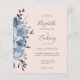 A borda esquerda deste convite romântico de casamento apresenta um buquê floral de cor d'água de flores azuis poeirentas e folhagem. O texto personalizável combina letras de mão, letras em copperplate e fontes itálicas em azul marinho em um plano de fundo cor-de-rosa pincelado. O lado inverso é uma mancha sólida coordenadora.