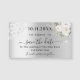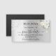 Um cartão magnético de salvamento de data para um casamento. Um fundo falso, de aspecto prateado, decorado com rosas brancas, flores e rendas brancas. Personalize e adicione uma data e seus nomes. O texto: Salvar a Data é gravado com um script de estilo com letra de tendência grande.