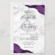 Uma design de cor d'água púrpura, aparada com brilho falso prateado, aparece em dois cantos deste elegante design. Personalize-o com os nomes dos casais em escrita manual roxa escura sobre uma grande e grande cinza. Adicione os detalhes do casamento em placas pretas e fontes itálicas em uma cinza e fundo de mármore branco. O verso apresenta um design de agata prateado e roxo correspondente.