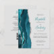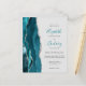 A borda esquerda deste elegante convite de casamento moderno apresenta uma cor azul-lacrimejante agata borda com falso brilho prateado. O texto personalizável combina o script de escrita manual com a placa de reprodução de cinza de carvão e fontes itálicas em um fundo de cinza pálido. O verso oferece espaço para detalhes do casamento, juntamente com um código QR que os convidados podem digitalizar para visitar seu site e RSVP, o que economiza o custo de impressão e envio de cartões RSVP separados.