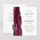 A borda esquerda deste elegante e moderno convite de casamento mostra uma cor vermelha e entrelaçada de água com uma falsa brilha prateada. O texto personalizável combina o script de cinza de carvão e as fontes sans serif em um fundo branco. O verso fornece espaço para detalhes do casamento em um fundo branco sólido, junto com um código QR que os convidados podem digitalizar para visitar seu site e RSVP, o que economiza o custo de imprimir e enviar cartões RSVP separados.