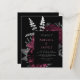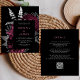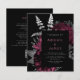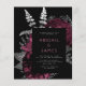 Este elegante e modesto convite de casamento apresenta um buquê floral romântico e luxuoso em vermelho burgundy, com folha de cor prateada e folhagem brilhante num fundo negro. Personalize o texto da lata de burlagem pálida e da cinza prateada em fontes na moda num retângulo escuro. O verso fornece espaço para detalhes do casamento em um fundo preto sólido, junto com um código QR que os convidados podem digitalizar para visitar seu site e RSVP.